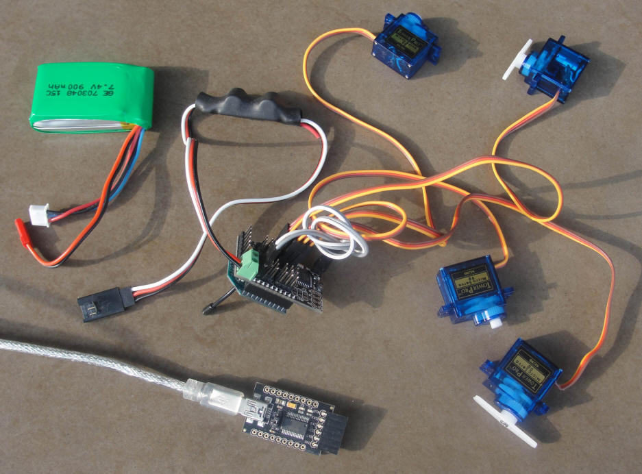 值得注意的是,图8中7.4V锂聚合物电池不能直接连在控制器电源端口上给舵机供电,因为mini舵机的供电电压不能超过6V,否则会出现异常噪音,不能正常工作,所以锂电池要接上一个降压模块才能给舵机供电。我用的这个降压模块的型号为DPC-1,它的输入电压为6~8.4V,输出电压为5V,电流为2A,这样就达到了给四路舵机供电的要求。