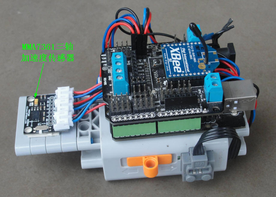 这个乐高星战车电控改造模型里的电控部件里,除了Flyduino控制器、Arduino UNO、传感器扩展板,还用到了两个特别点的电控部件,一是XBee无线数传;二是MMA7361三轴加速度传感器,这个两个电控部件,我在前面文章都介绍过,
