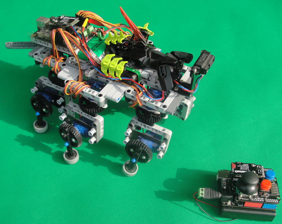 这篇文章的项目把遥控和自控集成在一套程序里完成。采用DFRobot公司的游戏杆模块作为遥控器,不仅实现遥控六足机器人前后左右行走,而且通过它切换机器人遥控和自控两种模式,自控模式是躲避障碍物,自主寻找行走路径。