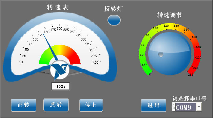 由“索引数组”函数的索引0生成的字节数据通过“条件结构”函数,把标识了电机正反转的字节转换“反转灯”布尔量真假值,从而使电机反转时,在前面板中对应的指示灯会亮,电机正转时,则指示灯熄灭。“索引数组”函数的索引1和2生成的两个字节就是Arduino上传的电机实时转速的高字节和低字节,它们经过算术运算,就可以得到电机每分钟转速值,并会立即显示在前面板的“NI Themed Gauge”仪表盘上。