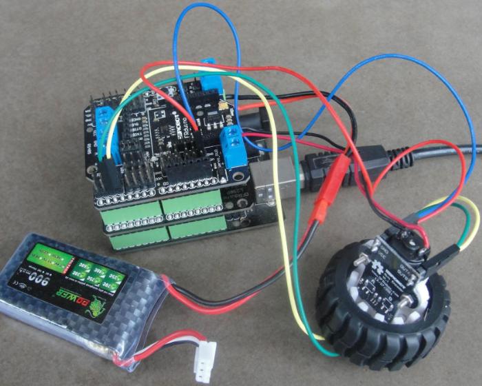 我这次实验,采用的是外接电源,900mA锂聚合物电池给电机驱动供电,而Arduino UNO控制板的供电是利用USB线中的5V电压,两套电源分开供电,互不干扰。