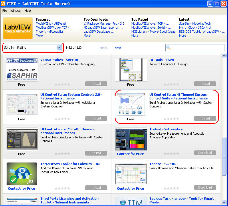选择Sort By为“Rating”,再一页页地翻看,找到下图我用矩形框标注的NI主题定制套件(NI Themed Custom Suite)的控件库组件,点击下载,并安装。见图6所示。