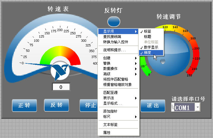 基于Windows的软件有一个操作技巧就是右键快捷菜单,当你要了解和设置软件的控件或者函数时,只要在它们上面点击鼠标右键,就会出现快捷菜单。如果现在我需要针对“NI Themed Gauge”控件,让它显示出一圈由绿变红的数值梯度条,同时显示实时数字,那就点击鼠标右键吧,看看随之出现的快捷菜单,能不能帮助到你。办法是:把快捷菜单的“显示项”中的“梯度”和“数字显示”打上√即可,见图9所示。