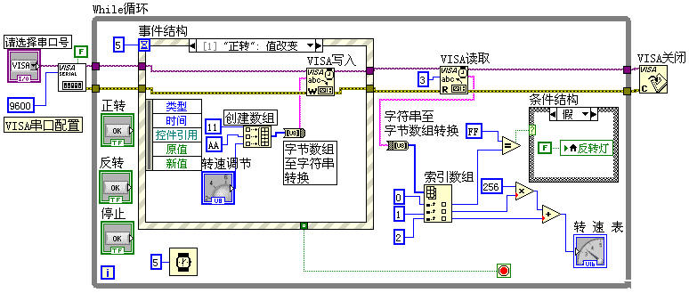 VISA读取函数VISA Read从串口读取下位机发送的字符串,每次读取字节数我设置为3,它的输出通过“字符串至字节数组转换”函数和“索引数组”函数,把字符串转换为3个无符号字节数据,这3个字节数据分别包含了一个字节的电机正反转标识和两个字节的电机转速信息。
