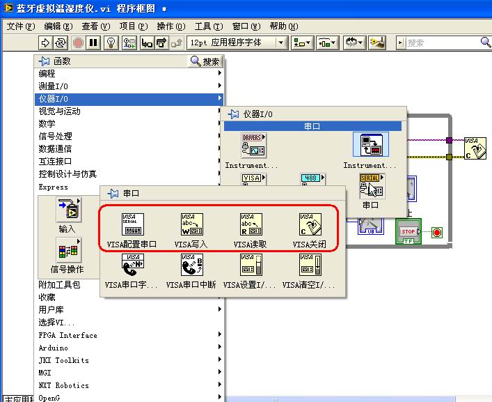 要编写串口通信程序,不仅要具备Labview软件,还必须另外安装NI_VISA串口通讯协议驱动。安装完NI_VISA,在框图程序界面空白处右击鼠标,出现函数工具库面板,再点击“仪表I/O”→“串口”,就会出现串口函数VI子面板,如下图。