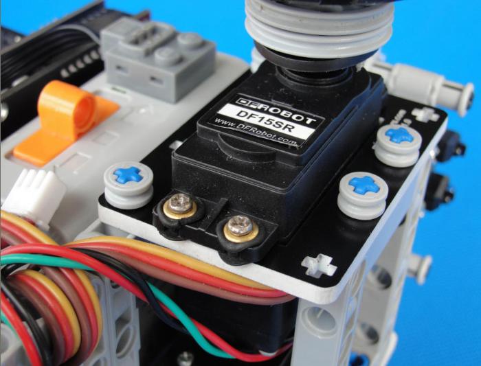 小车由两个型号为DF15SR的360度舵机驱动,舵机驱动的好处是它不需要专门的驱动板,直接连到DFrobot公司XBee传感器扩展板的数字端口即可,方便省心。