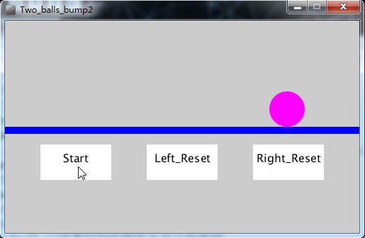 画面中,一条直线上方一个圆球向左或向右移动,按下直线下方的"Left_Reset"按钮,圆球回到左边初始位置,这时如果按下"Start"按钮,圆球向右移动,直至从画面消失。按下直线下方的"Right_Reset"按钮,圆球回到右边初始位置,这时如果按下"Start"按钮,圆球向左移动。并且,当用鼠标拖动圆球边沿时,圆球会随之放大或缩小。