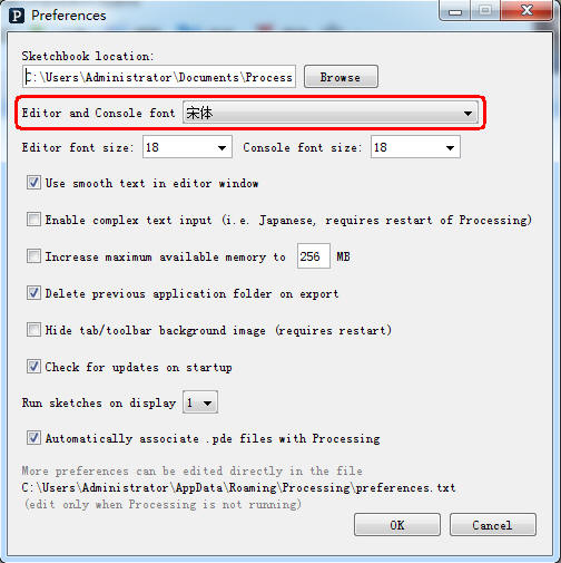 注意:新版Processing 2.2.1可以显示中文注释了,点击File→Preferences。把“Editor and Consoles font”字体切换为“宋体”即可,另外下面的“font size”字体尺寸也可以修改,数字越大,字体尺寸越大。