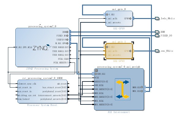 VIVADO工程如图1所示,用两个AXI_GPIO IP核分别连接LED和SW,工程建立全部使用自动连接。
