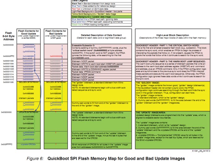 由于FPGA配置是从flash的0地址开始读取数据,所以将QuickBoot Header 放在0地址非常关键。QuickBoot Header包括两个部分,第一部分就是关键开关字,第二部分就是热启动跳转序列。关键开关字,根据配置模式的不同而不同,如BPI模式就是0x00 00 00 BB,而SPI模式就是0x0xAA995566。如果关键开关字是ON,那么就执行热启动跳转序列,热启动跳转序列包含了需要跳转的地址。然后就跳转到update bitstream area。并且将update bitstream下载下来。如果关键开关字是OFF,那么就忽略热启动跳转序列,并且继续往下读取数据,这样就可以将golden bitstream area的数据下载到FPGA。
