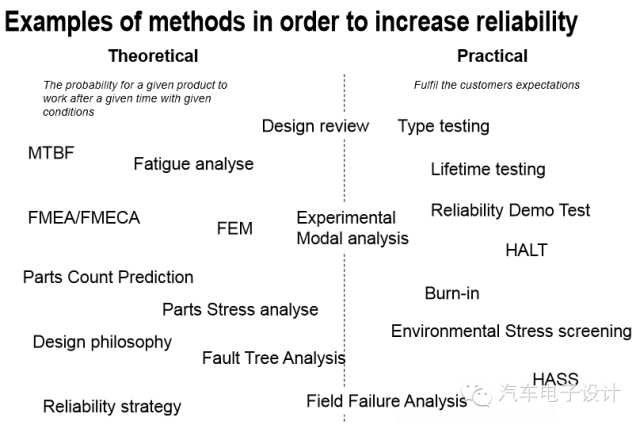 应该说在整车企业,产品工程师和验证工程师,在可靠性的职责是各有专职,但是以验证工程师为主,前者对IPTV负责,后者是做实验(可能是供应商来做)、验证和实验数据处理的。在零部件企业,硬件工程师和测试工程师的分工大概也是如此,一个管电路拓扑设计的裕度和部件参数的裕度,一个是通过调整样品和测试时间,监控测试过程,分析测试数据,以得到相对的可靠性数据。当然这里,并不是一部到位的,需要通过分析来扫雷,通过定性试验来确定薄弱区域,通过定量实验最终确定是否满足要求。