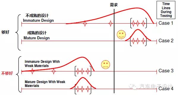 从大的格局来看,汽车的开发周期,汽车部件的开发周期,都是被硬逼着一点点缩短的,而其本身又有着使用者众多、使用时间长,安全要求比较高等特点,没办法 给你那么多机会试错。有限的开发时间内,不管以前是否有基础,不管现在的产品革新有多大,拿出来的就是一个成熟的设计,如下图所示,通过有限的样品的数 量,来确定其特性及差异分布是满足需求的,这样才是整个开发&验证过程的核心价值。