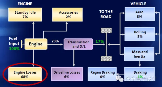MJ与Kwh的换算是1 MJ = 0.277778 kwh; 1 kwh = 3.6 MJ,因此可以得到约为:汽油的质量能量密度为 12330Wh/kg,体积能量密度为9000Wh/L,当然由于内燃机效率的问题,其本身就有很大的损失,其效率传递是完全不同的,按照下图的看法发动 机内部的能量损失为68%,只有32%得到利用了;电池的话,以损失10%,剩余90%计。