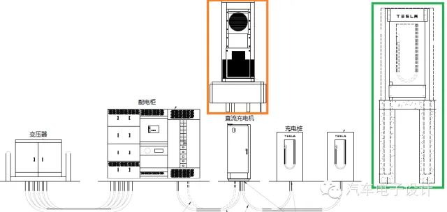 3)直流充电机与充电桩一一配置,远离客户,走线通过地下传输