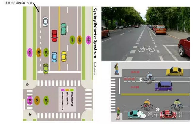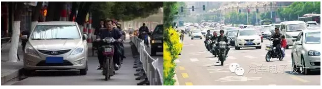 毕竟来说,机动车上面做功能更现实些,所以我们解决问题的思路是从汽车上下手,而不是在电动自行车上,中国的路权之争由来以久,我们工程师做的事情是在现有的局面下做改良。如下图所示,我们要接受电动自行车作为“非机动车”奔跑在机动车道上这一事实。