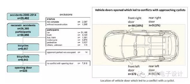 这个事在《Investigation of bicycle accidents involving collisions with the opening door of parking vehicles and demands for a suitable driver assistance system.》专门做了一些调研,选取自行车事故中牵涉车门的案子,根据四个门进行统计