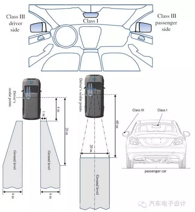 从汽车原有的安全性分析来看,汽车驾驶员可以从左右后视镜、中间的后视镜来观察后续的情况,这在UN R46定义后视镜ClassI和Class III里面有明确的要求,这有个很大的特点,就是被动的需要老司机去检查和提醒乘员。