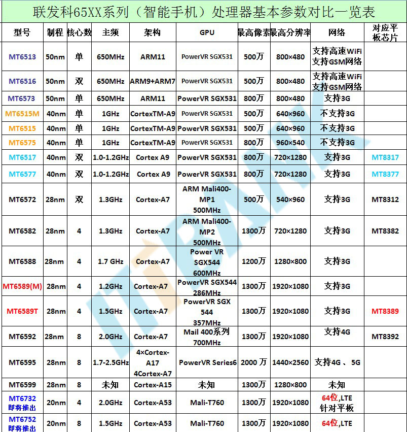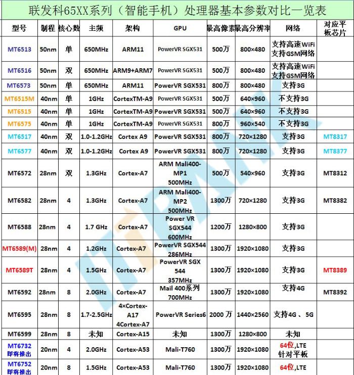 联发科65XX系列(智能手机)处理器基本参数对比一览表