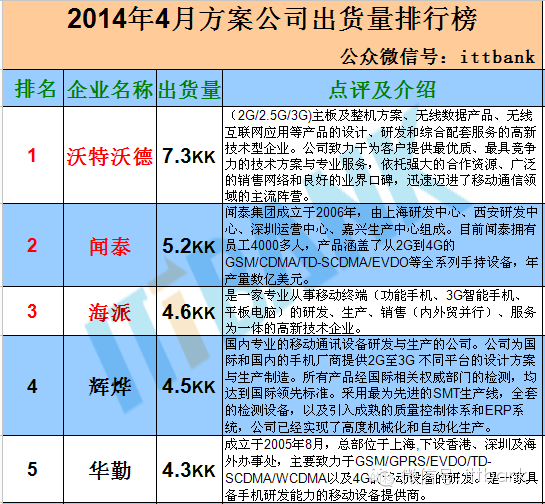 2014年4月方案公司出货量排行榜如下:(更多精彩关注公众微信号:ittbank)