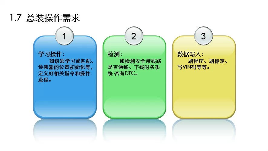 第一为学习相关的操作。如学钥匙、传感器位置的学习等。如果只是给总装的操作指导,则这类操作的定义只需写一个交互操作的过程,是十分简单的,但如果是给相关模块及工具的(程序)提供商的定义,则需写明具体在每一步采用什么指令进行什么数据的读写操作(需结合自身的诊断协议和通信规范),又是如何判断和反馈是否成功了、给操作者提示什么及如何提示等细节。