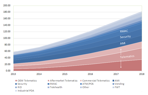 图2: 2013年-2018年,工业级应用中M2M模块的出货量变化(数据来自ABI research)