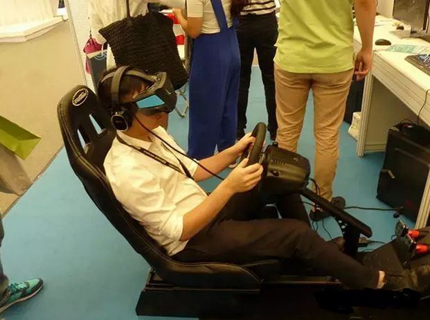 图:用“星轮”VR显示头盔配合震动座椅玩赛车游戏给人以无以伦比的驾车体验