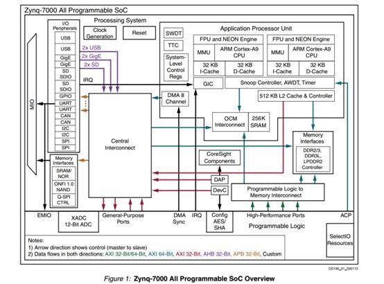 我们就来看《Zynq-7000 All Programmable SoC Overview》这篇文档的介绍来分析Zynq这颗芯片的基本架构,其实说了解架构有些复杂了,简单地说就是了解Zynq这颗芯片内部的ARM与FPGA之间是怎么交互的,这样才能让我们才可以很好地利用ARM与FPGA资源。