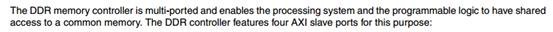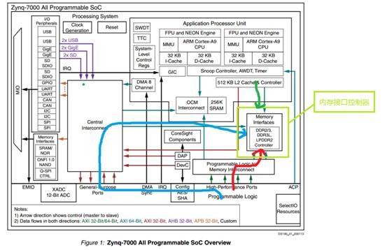 我们依然看Zynq的整体结构图,内存接口控制器是个多端口访问,可以允许处理器与逻辑部分共享同一个内存。