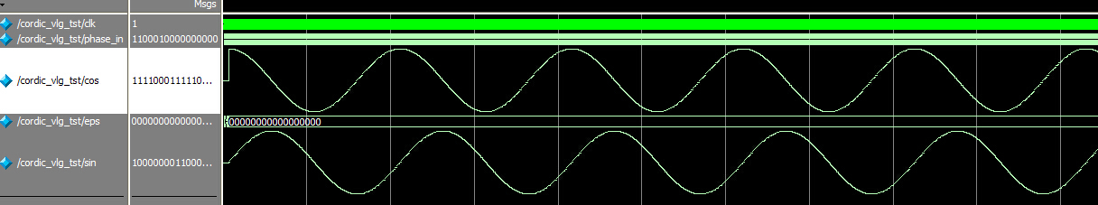 `timescale 1 ns/ 1 ps module cordic_vlg_tst(); reg clk; reg [15:0] phase_in; // wires wire [16:0] cos; wire [16:0] eps; wire [16:0] sin; localparam coef=1000; // assign statements (if any) cordic i1 ( // port map - connection between master ports and signals/registers .clk(clk), .cos(cos), .eps(eps), .phase_in(phase_in), .sin(sin) ); initial begin clk=0; phase_in=0; #100000 $stop; end always #10 clk=~clk; // phase_in[16:15] // 2'b00: //if the phase is in first quadrant,the sin(X)=sin(A),cos(X)=cos(A) // 2'b01: //if the phase is in second quadrant,the sin(X)=sin(A+90)=cosA,cos(X)=cos(A+90)=-sinA // 2'b10: //if the phase is in third quadrant,the sin(X)=sin(A+180)=-sinA,cos(X)=cos(A+180)=-cosA // 2'b11: //if the phase is in forth quadrant,the sin(X)=sin(A+270)=-cosA,cos(X)=cos(A+270)=sinA always @(negedge clk) begin // phase_in=16'b10_11_1111_1111_1111; phase_in=phase_in + 8'b1000_0000; end //0____90 //0____1 //0____65536 endmodule