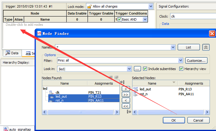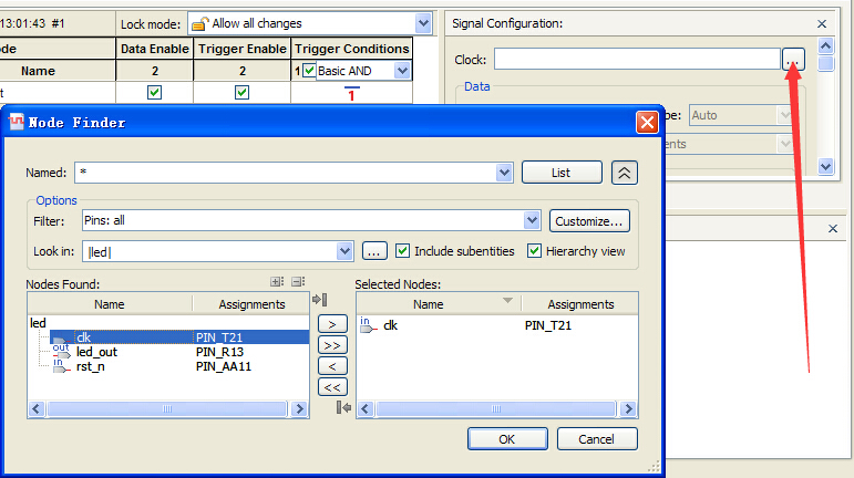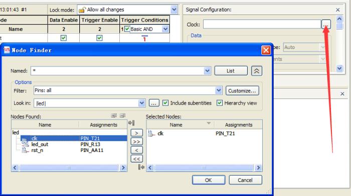 3、在node双击添加需要观察的数字信号;不要调入系统时钟,因为本例打算用系统时钟来做逻辑分析仪的采样时钟