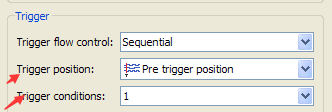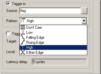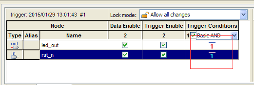 7、设置触发输入:选择触发信号以及触发方式,flag为触发使能信号,实际工程中没用,只是signaltap ii的使能信号;高电平触发,设置如下: