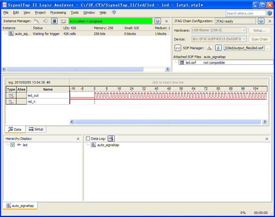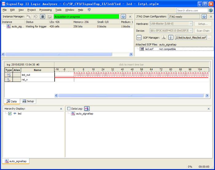 注意:flag为边沿采样信号,当flag变化的时候,恰好warm_data在稳态,因此将flag作为采样的触发;当然在低速地要求的情况下,flag也可以省略,SiganlTap II 会自动根据一定频率采样。