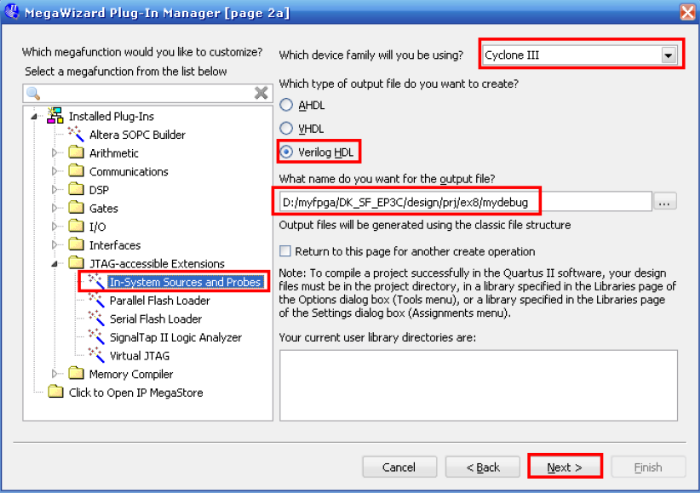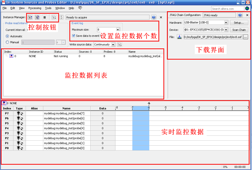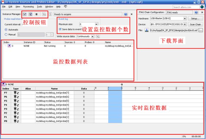 In-System Sources and Probes Editor,这种方式是通过例化一个定制的寄存器链到 FPGA 器件内部。这些寄存器链通过 JTAG 接口与 Quartus II 通信,它又能够驱动 FPGA 器件内部的某些输入节点信号,采样某些输出节点信号。这就使得调试者不用借助外部设备就能够给 FPGA 添加激励并观察响应。