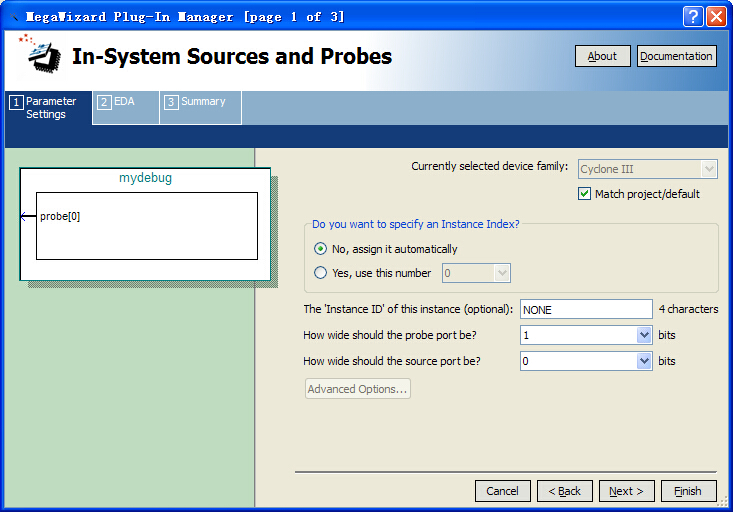 5、第二步 EDA 不需要做设置,我们来到 Summary 配置页面,注意要勾选 mydebug_inst.v