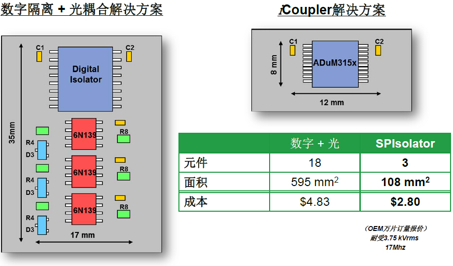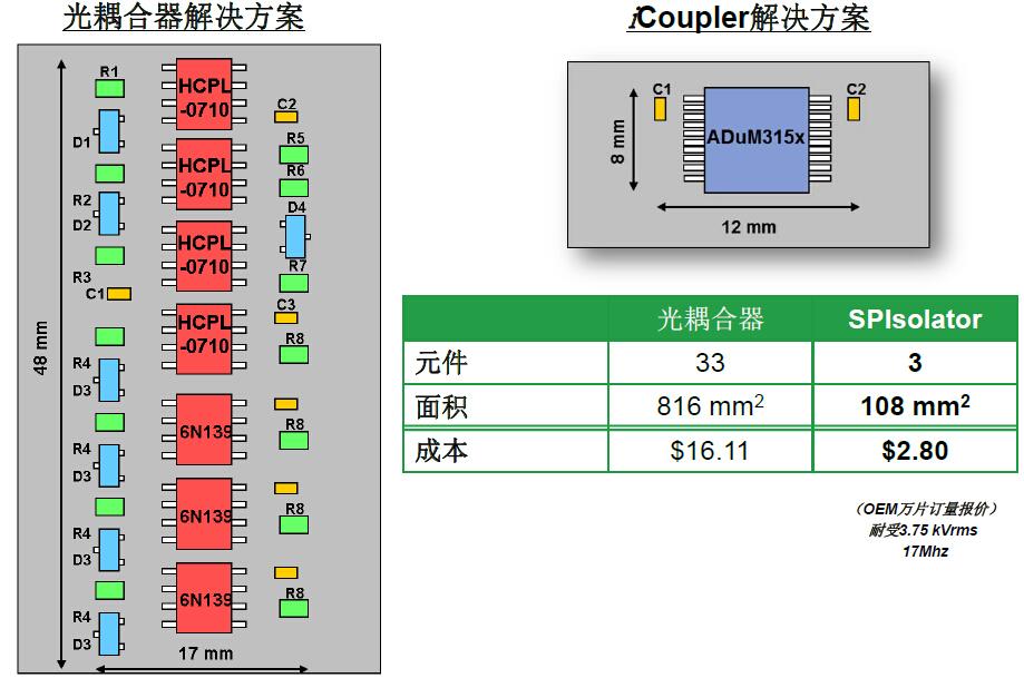 与基于数字隔离+光耦合解决方案相比,高度集成的ADuM315x能够将系统设计中所需元件数量从18个减少至3个,成本只需一半左右。