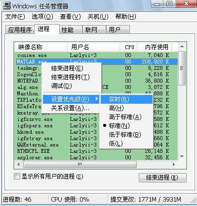 于是,费劲心思地去找地址信号以及相关信号的设计问题,找不到呀!后来,终于发现,我这样对地址信号的初始化设计是要有一个前提的,就是MATLAB发串口数据时必须连续地发,即字节之间是不能有停顿的,这就要求MATLAB具有实时性。但在windows这样一个多任务操作系统中,是不可能保证实时性的,就算在任务管理器中把MATLAB进程优先级设置为最高的实时(下图),也达不到实时(因为我试过,在设置为实时之后,FPGA还是会出现上一段中描述的问题)(另外,在Linux下会不会有这样的问题我没试过,不过我猜还是会有问题吧,毕竟它也是一个多任务的操作系统)。
