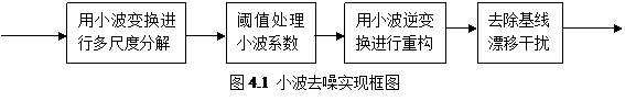 通过上文介绍的三种小波滤波方法,本文采用阈值去噪和去除低频逼近信号相结合的方法实现心电信号的滤波。该算法利用小波的多分辨率特性,首先通过Mallat算法对ECG信号进行多尺度分解,观察不同尺度下细节信号和逼近信号的特点,在分解的各个尺度上用启发式小波阈值(heursure)函数方法对小波系数进行处理,然后用各尺度上的估计小波系数重构原始信号,最后去除近似于基线漂移干扰的逼近信号的重构信号。小波变换去噪框图如图所示: