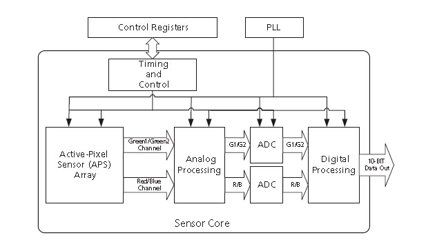 可以独立地控制两个MT9D112相机,并获得两个分离的,同步的图像内容。通过一个双线接口来控制它们。每个相机都有一个两百万像素的传感器阵列,使用Bayer滤色矩阵的方式排列。传感器的读出数据是10位的,并支持行或列的跳跃和装仓。