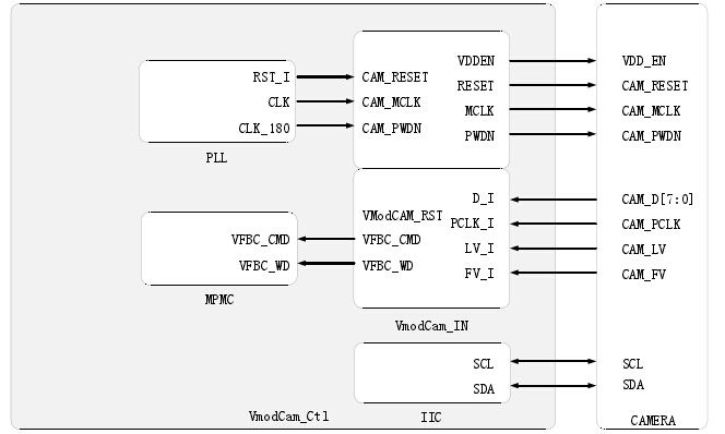视频数据的采集主要由VmodCam_IN, IIC, xps_pll等三个IP核协同完成,xps_pll主要为视频采集板卡提供主时钟、复位信号;IIC控制器则用于对视频采集板卡视频输出模式进行配置;