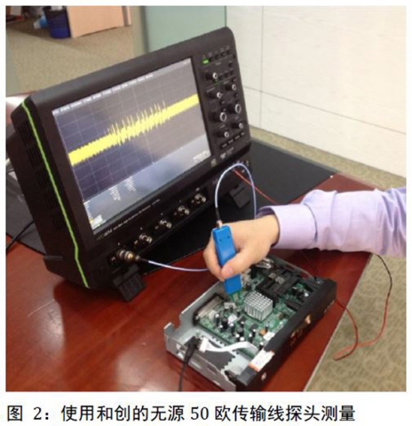 另一种替代的方案是使用定制的无源传输线探头。如图2所示为和创定制的无源传输线探头,其探针可直接点测0603电容的两端,测量电源噪声非常方便快捷。该探头有直流耦合和交流耦合两种选择,如果使用的示波器必须隔直后测量电源噪声,可以使用后者。