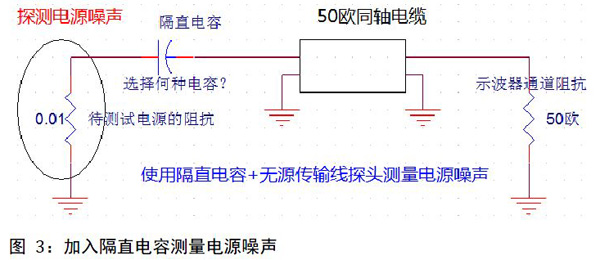 使用方案3的原因是:由于部分实时示波器的垂直刻度为5mV/div时,偏置电压在1V以内,无法测量高于1V的电源噪声,所以,需要使用隔直电容隔离电源噪声的直流成份后再测量。这种测试方法的缺点为隔直电容可能会影响测试结果,选择不同的电容可能有不同的测试结果,接下来将分析不同隔直电容时的噪声测试结果,供读者参考。