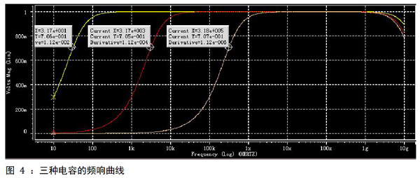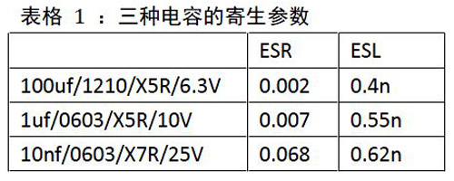 下表1为Murata的三种陶瓷电容的等效串联电阻ESR和等效串联电感ESL,为了便于分析问题,在仿真和计算过程中做了一些简化,没有考虑在不同DC BIAS电压时电容容值的变化,也没有考虑探测部位、表贴电容引入的寄生电感,使用HSPICE仿真频响曲线结果如下图4所示: