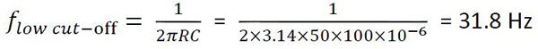 图4中,X轴为频率的对数坐标,Y轴为幅度,黄色、红色、灰色依次为100uf、1uf、10nf电容时电路的频响曲线,容值越大,电路低频截至频率越低,图4中3个marker为3根曲线的3dB低频截至频率点。可见,100uf的低频截至频率为31.7Hz,1uf电容的低频截至频率为3.17KHz,10nf电容的低频截至频率约为318KHz。如果没有仿真软件,也可以通过公式直接计算,如下计算了100uf电容的低频截至频率,与仿真结果完全一致。
