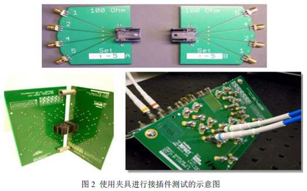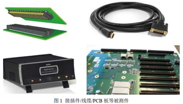 对于相当多的被测试产品,如接插件、使用插槽的电路板等都需要使用专门的夹具才能进行S参数测试,这是因为这些被测件的接口通常是非SMA或者BNC等通用接口类型的,而S参数测试仪器如SPARQ、VNA等仪器的连接接口通常都是SMA或者BNC等标准类型的,因此被测件和测试仪器的连接需要辅助夹具。如下图1所示为一些需要夹具才能够进行S参数测试的被测件(左下脚图片为Teledyne LeCroy(力科)的信号完整性S参数测试仪):