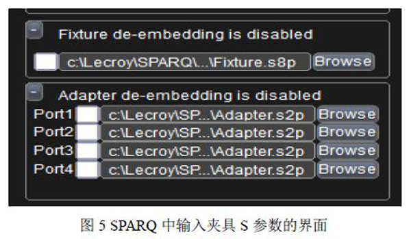 从上图4可见,对于一个具有P个端口的被测件DUT,将需要2P个端口的夹具,其中P个端口与测试仪器的P个端口相连接,另外P个端口与被测件DUT相连接。如果知道具有2P个端口的夹具的S参数,那么对夹具的去嵌将变得非常容易。如Teledyne LeCroy(力科)公司的信号完整性S参数分析仪中就集成了基于S参数的夹具去嵌方法。如下图5所示,只要将夹具所对应的:*.snp的S参数文件带入到图5的界面设置中即可实现对于夹具的去嵌。但是正如前文所述,获取夹具的S参数是关键。