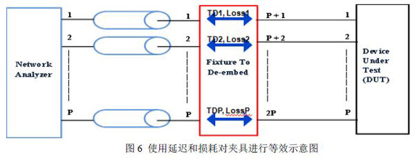 时域Gating方法是将上图4中的夹具中的传输媒介使用传输线的原理进行等效,只要获得每一个通道的两个参数:延迟(TD, Time Delay)和损耗(Loss)即可实现对夹具的去嵌。而延迟和损耗参数是比较容易得到的,如果是专业厂家的夹具或者线缆,通常会给出这两个参数的值,如果是自己设置的夹具,那么一个办法是可以通过EDA仿真软件获得这两个参数;第二个办法是可以通过简单方便的实际测量获得。后续我们会介绍如何通过测量的方法获得这两个参数。下图6为将具有2P个端口的夹具使用延迟和损耗进行等效的示意图。