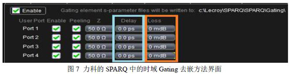 下图7所示为Teledyne LeCroy(力科)的SPARQ中使用时域Gating方法使用夹具的延迟和损耗两个测试方法进行夹具去嵌的界面: