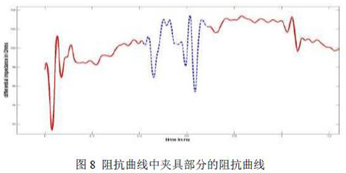 时域Gating方法是通过将整个测量系统(包括夹具和被测件DUT)的S参数先通过算法转换为阻抗(Z),然后通过夹具的延时和损耗两个参数将整个系统的阻抗曲线中的夹具部分的阻抗曲线剥离掉,然后将剥离掉的夹具的阻抗曲线后的部分重新转换为S参数,从而实现夹具的去嵌。如下图8所示,蓝色虚线部分为夹具的阻抗曲线: