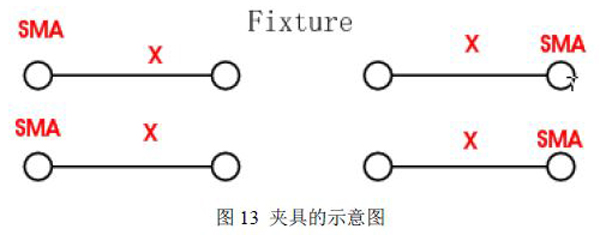 如果夹具或者探头的延时和损耗参数是未知的,那么也可以通过使用2X直通线来估计夹具或者探头的延时和损耗。因此在夹具设计时,建议在夹具上增加一条2X直通线,以用于测量夹具/探头的损耗。如下图13所示为一个夹具的示意图,标注SMA的端口是与测试仪器相连接的,标志SMA的端口的线段的另外一个端口为与被测件DUT相连接的。这个线段的长度为X,那么2X直通线即是指两个端口都有SMA接口的且长度为2X的直通连线。