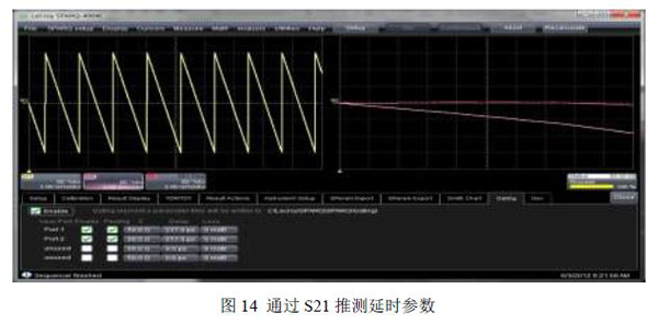 首先我们可以通过S21的阶跃响应特性或者基于TDR技术(TDR阻抗曲线)来初步估计延时。然后对2X直通线使用剥离(Time Domain Gating)算法,经过剥离去嵌后,理论上该2X直通线应为0损耗,但由于当前的延时参数是粗略估计的,因此需要通过微调以获得更加精确的值,可通过相位的测量来进行微调,如下图14中的左侧黄色波形所示,去嵌前相位应该是周期变化的;经过去嵌后,理论上相位应该为0,即为一条位于0位置的水平直线,但实际情况由于该延时值还不是一个非常理想的值,因此可以适当调整该参数值,直到相位曲线为一条水平的直线,如下图14中的右侧波形所示,当延时参数为217ps时,相位曲线已经接近一条水平直线。